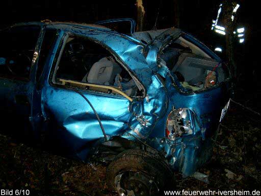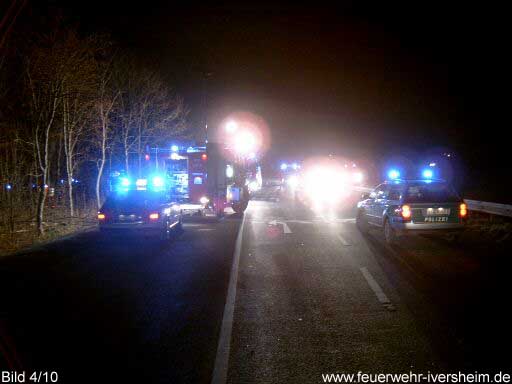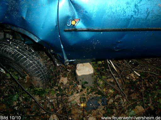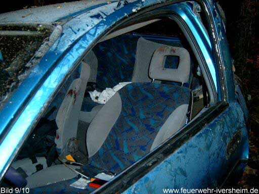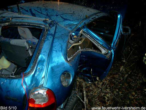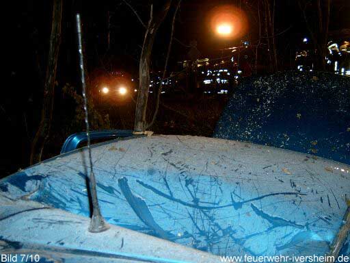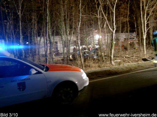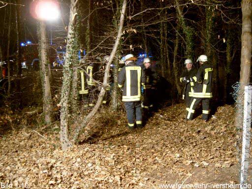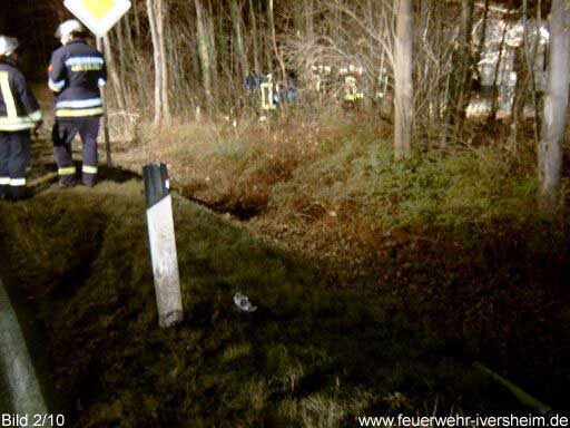 Am Morgen des 09.12.2004 wurde die Löschgruppe Iversheim zusammen mit der Löschgruppe gegen 04:31 alarmiert. Gemeldet wurde ein Verkehrsunfall mit einer eingeklemmten Person. Die Wehr rückte mit beiden Fahrzeugen aus. Am Unfallort fanden die Wehren ein Fahrzeug inmitten von Bäumen vor. Das Fahrzeug war von der Bundesstraße 51 abgekommen, einen Abhang hinunter gestürzt und zwischen den Bäumen stehen geblieben. Um an den Fahrer zu kommen, mussten einige Bäume gefällt werden. Danach befreiten die Feuerwehrmänner die Person mit Schere und Spreizer aus dem Fahrzeug. Die Besatzung des RTW Bad Münstereifel sorgte zusammen mit dem Notarzt aus Euskirchen für die medizinische Versorgung. Nach dem die Person in den RTW verbracht wurde, konnte das Fahrzeug mit dem Rüstwagen aus dem Graben gezogen werden. Neben den Löschgruppen Iversheim und Arloff wurden die Feuerwehr Bad Münstereifel mit dem zweiten Rüstsatz und die Wehrführung alarmiert.